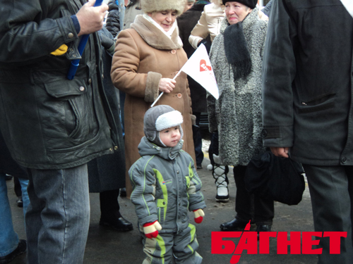 Кроме пенсионеров, под Генпрокуратуру пришел даже малыш. Вернее, его привела мама. Ребенок с интересом смотрел на флаги, толпу и видеокамеры, потом на него нацепили «батькивщиновский» значок.