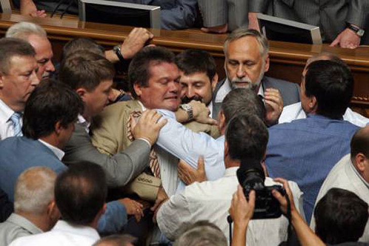 В последнее время своим горячим запалом и коллективной солидарностью отличилась и Украина. И это при том, что за 16 лет независимости Украины в Верховной Раде произошло свыше 50 драк между депутатами. Однако в отношении массовости по-настоящему выделиться нашим народным избранникам удалось только сейчас. 16 декабря 2010 года, в сессионном зале парламента произошла драка между партией власти и оппозицией, которые утром блокировали президиум, трибуну и правительственную ложу парламента. Всего в драке участвовали 70 депутатов (около 40 «регионалов» и 30 «бютовцев»). В результате одному из депутатов сломали руку, а двоих отправили в реанимацию. Потасовка сопровождалась использованием подручной мебели – стульев. Исполнение так себе, ну да ничего, этим Украина отличилась раннее, а именно 27 апреля 2010 года. Тогда спикера забросали яйцами, а сам парламент погрузился в дымовую завесу после использования шашек.