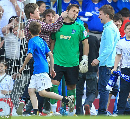 Юные фаны английского «Честерфилда» выбежали на поле и вступили в перепалку с вратарем соперников, а затем один из фанатов ударил голкипера, сообщает ИА «НАШ ПРОДУКТ». Это случилость после одного из голов «Честерфилда». Матч закончился победой «Бери» со счетом 3:2.