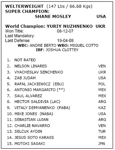 В отношении поединка Нужненко-Сенченко WBA пытаясь как-то выкрутиться подрихтовала свой рейтинг и Юрия Нужненко засчитала в чемпионы, а претендента Вячеслава Сенченко поставила на третью позицию своего шорт-листа (см. рейтинг), при этом суперчемпионом Ассоциации является Шейн Мосли, который в мировом списке также занимает первую позицию.