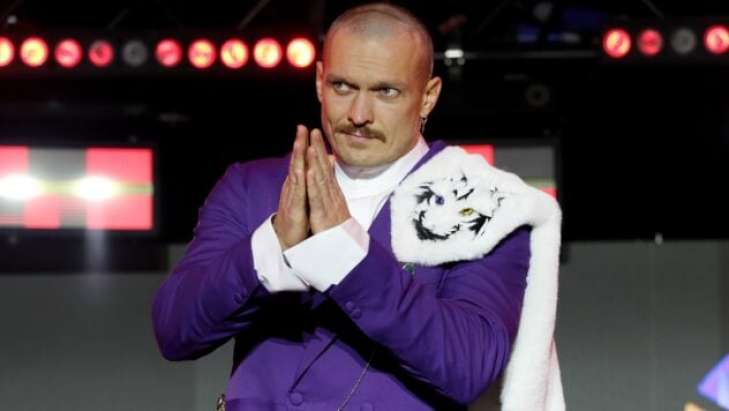 Усик появился на публике в стильном костюме вместе со своей командой. На плече костюма был элемент меха с головой тигра с голубыми и золотистыми глазами.