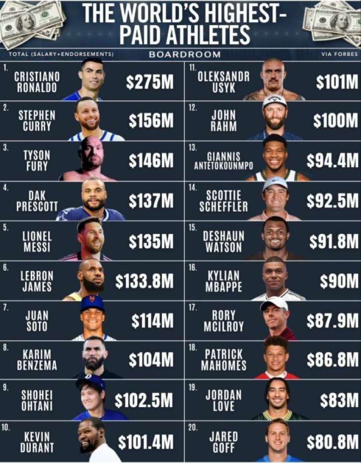 Лідером рейтингу став Кріштіану Роналду, який заробив $275 мільйонів, друге місце зайняв баскетболіст Стівен Каррі ($156 мільйонів), а третю сходинку посів боксер Тайсон Ф’юрі ($146 мільйонів), повідомляє ForUA.