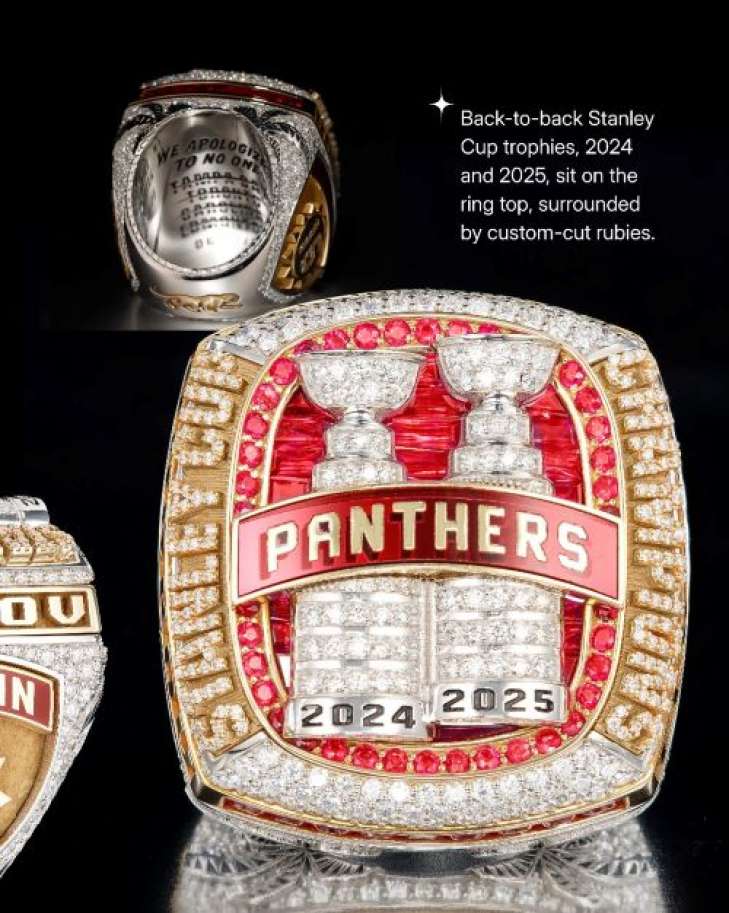 Крім того, на лівій стороні персня зображено логотип "Флориди" та нанесено ім'я власника (у хокеїстів також вказано ігровий номер). На внутрішній стороні кільця вигравірувано напис "Ми ні перед ким не вибачаємося", а також дата завоювання другого Кубка Стенлі (17 червня 2025 року) та чорний щур - один із символів команди.