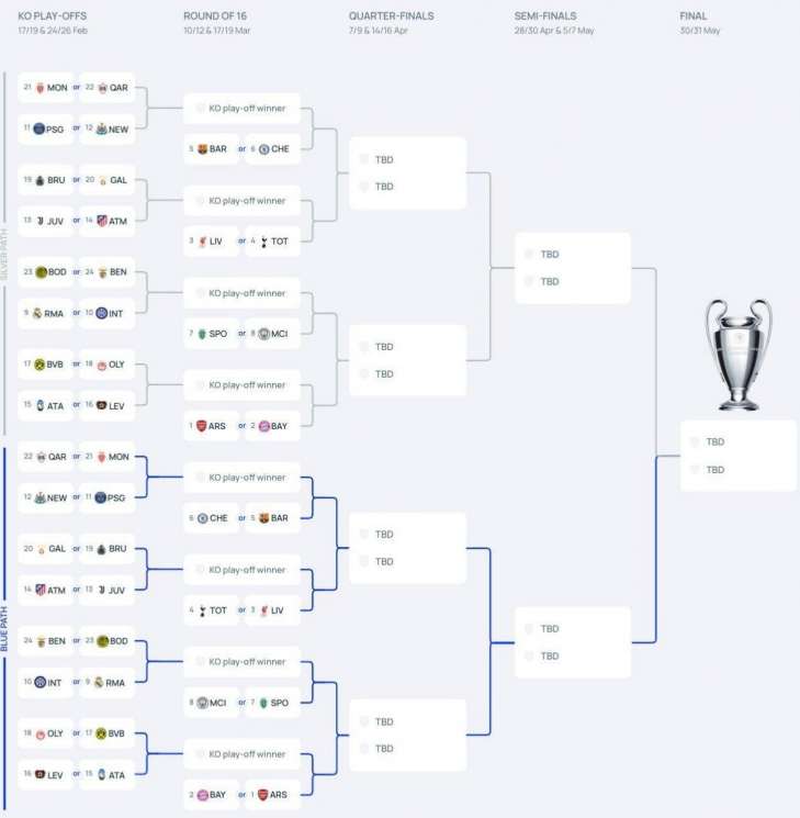 Загалом у плей-офф Ліги чемпіонів пробилися 24 команди з 36. Клуби з топ-8 автоматично кваліфікувалися до 1/8 фіналу, решта розпочне плей-офф з 1/16 фіналу. Вже визначились потенційні суперники учасників плей-офф.