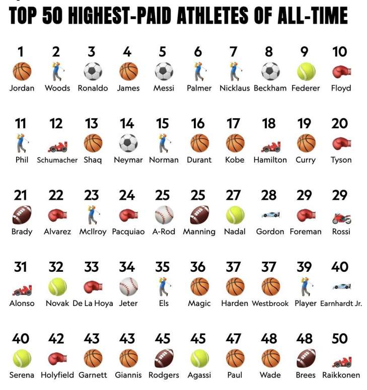 Легендарний американський баскетболіст Майкл Джордан став спортсменом найвищими заробітками всіх часів за версією Sportico. За кар'єру він заробив $4,5 млрд (реальний дохід шестиразового чемпіона НБА, який завершив кар'єру в 2003 році - $3,28 млрд - було перераховано журналом з урахуванням інфляції).