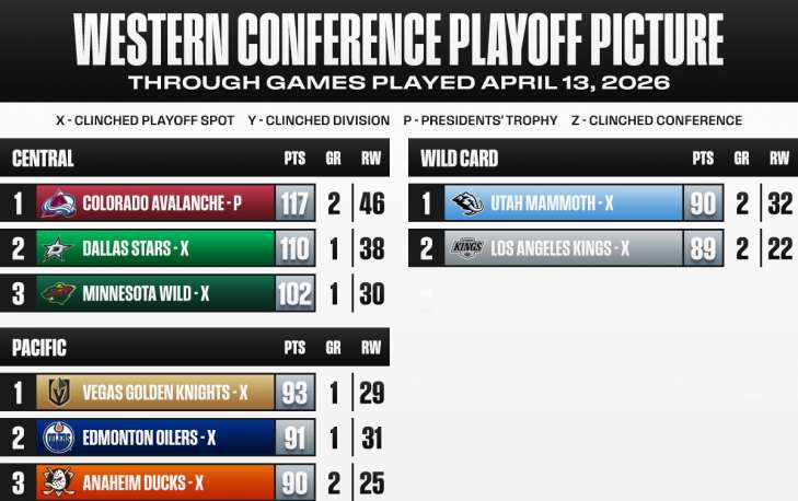 Регулярний чемпіонат НХЛ завершиться у ніч проти 17 квітня. Перші матчі плей-офф стартують у ніч проти 19 квітня. На даний момент відомі три пари: "Піттсбург" зіграє з "Філадельфією", "Даллас" зустрінеться з "Міннесотою", а "Монреаль" - з "Тампою".
