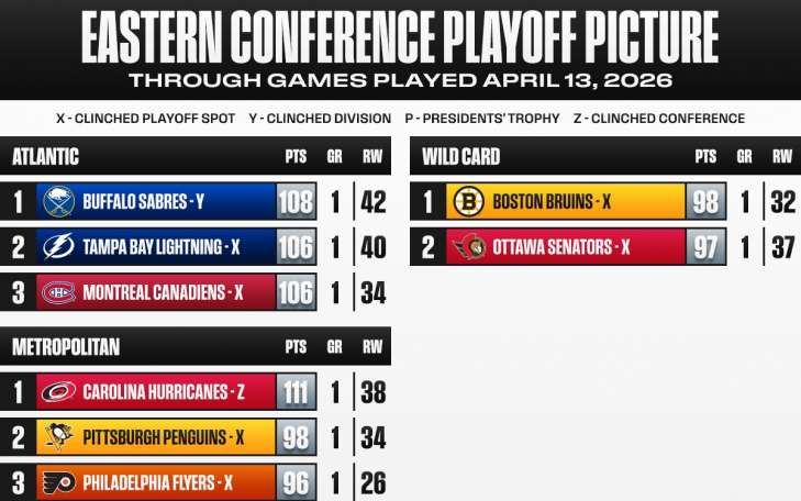 Від Східної конференції у плей-офф зіграють "Кароліна Харрікейнс", "Баффало Сейбрс", "Тампа-Бей Лайтнінг", "Монреаль Канадієнс", "Піттсбург Пінгвінс", "Бостон Брюїнс", "Оттава Сенаторс" та "Філадельфія Флайерс".