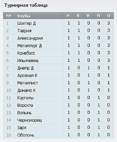 Отметим, лидером после 1-го тура УПЛ является донецкий «Шахтер» (см. таблицу). В первом матче чемпионата горняки обыграли киевскую «Оболонь» со счетом 4:0. «Динамо» после домашней ничьей с харьковским «Металлистом», занимает пока только 10-ю строчку в турнирной таблице.