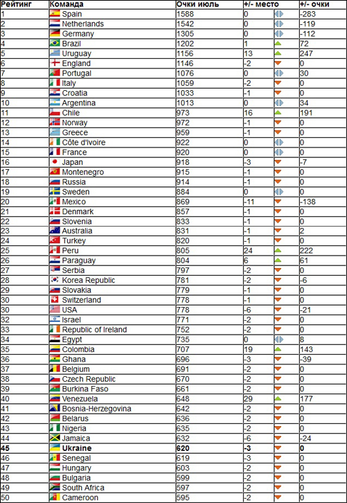 В июньском рейтинге подопечные Олега Блохина располагались на 42-м месте. Падение украинской команды объясняется тем, что сборные Венесуэлы, Колумбии и Перу после Кубка Америки-2011 поднялись на 29, 19 и 24 позиции соответственно, заняв места выше Украины, сообщает газета «Сегодня».