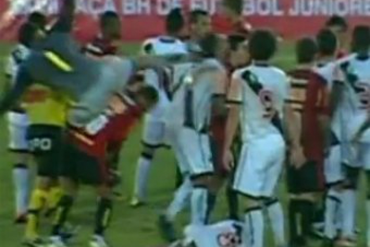 В матче молодежного первенства Бразилии между командами «Спорт Ресифи» и «Васко да Гама» произошёл шокирующий случай. В ходе возникшей во время матча потасовки 18-летний голкипер клуба из «Спорт Ресифи» Густаво с разбега прыгнул и ударил ничего не подозревающего игрока команды соперника Эливелтона ногой в шею, сообщает, сообщает 28 июля Topnews.ru.