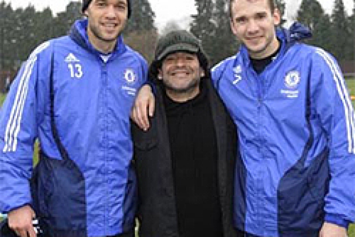 47-летний Марадона долгое время общался с Аврамом Грантом, а затем попозировал для фотографа, обнявшись с Андреем Шевченко и Михаэлем Баллаком. Для всех игроков это посещение стало огромным сюрпризом, а Джо Коул, кажется, радовался приезду Марадоны больше всех.