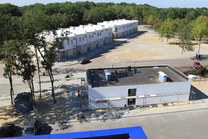 Контрольно-пропускной пункт на въезде на территорию комплекса готов по строительно-монтажной части. Ведутся работы по утеплению и облицовке мокрым фасадом. На прилегающей территории ведется укладка газона вдоль тротуаров.