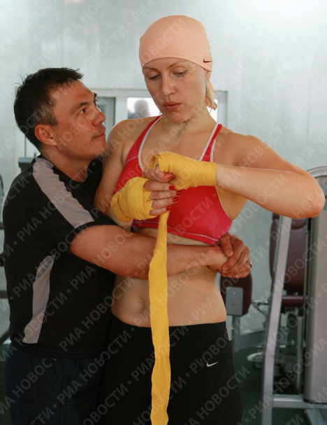 Абсолютная чемпионка мира во втором среднем весе Наталья Рагозина (справа) и бывший абсолютный чемпион мира Костя Цзю провели совместную открытую тренировку, сообщает РИА Новости.