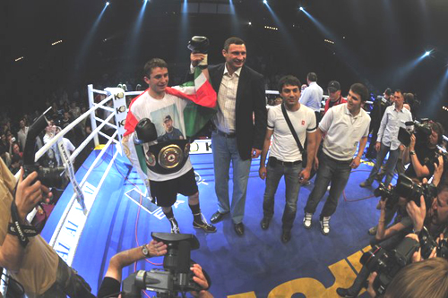 Чемпион мира по версии WBC Виталий Кличко поздравляет нового интерконтинентального чемпиона своей компании