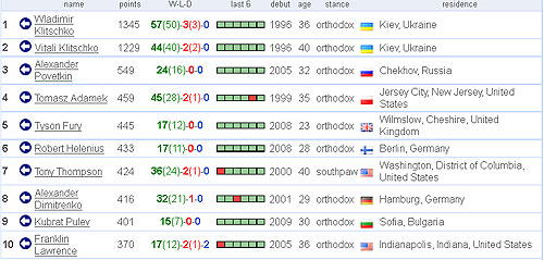 Возвращаясь к нашим прославленным братьям-боксерам, отметим, что на протяжении нескольких лет Виталий и Владимир возглавляют независимый рейтинг супертяжеловесов на статистическом боксерском портале boxrec, причем с большим отрывом от остальных супертяжей современности.