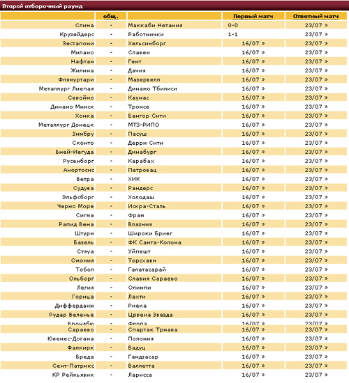 Как сообщает официальный сайт УЕФА, прошло два матча второго отборочного тура. Результаты смотрите в таблице.