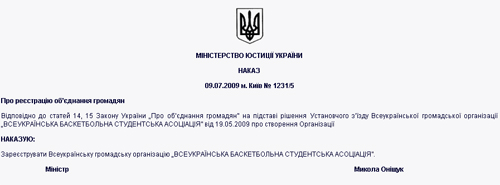 Согласно статей 14,15 Закона Украины «Про об’єднання громадян» утверждена «Всеукраинская баскетбольная студенческая ассоциация.