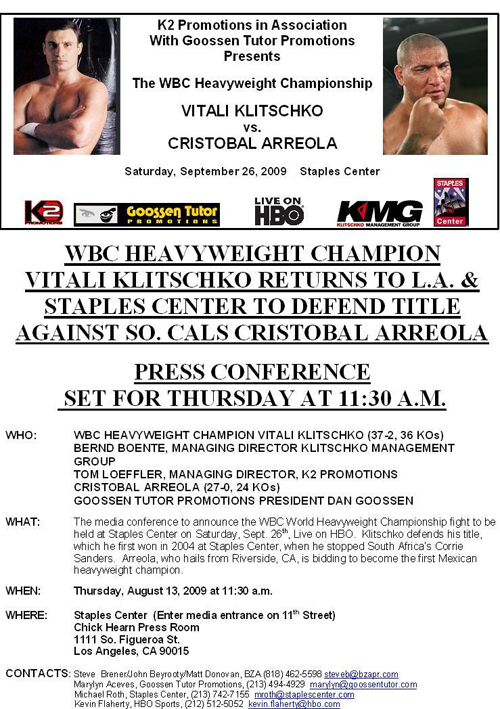 «Багнет» сообщал, что поединок между Виталием «Доктором Стальной кулак» Кличко и Крисом «Ночным кошмаром» Арреолой состоится 26 сентября в Лос-Анджелесе на арене Staples Center.