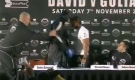 Британец во время пресс-конференции не остановился на словесных выпадах. В зале присутствовал «двойник» Валуева - человек сравнимого с ним роста, лицо которого было закрыто уродливой маской, а в конце пресс-конференции Хэй нанес удар по голове картонной статуи Николая Валуева, демонстрируя, что он сделает с российским боксером на ринге 7 ноября.