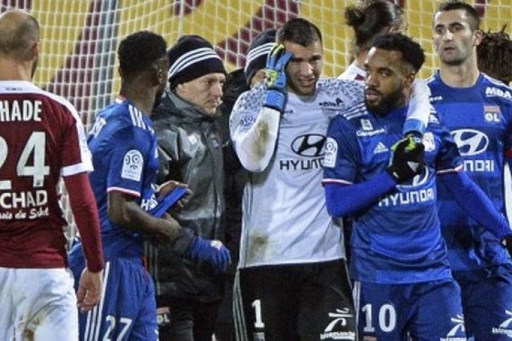 Во время матча чемпионата Франции по футболу во вратаря "Лиона" Антони Лопеша болельщики бросили две петарды