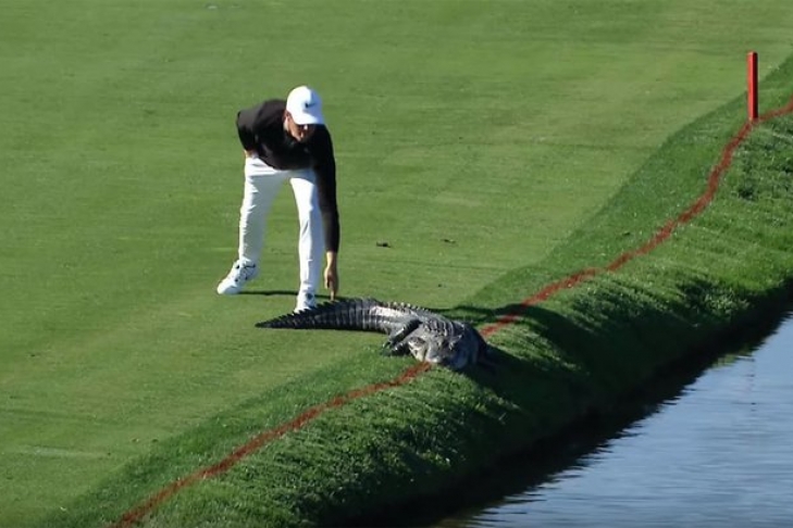 Во время проходящего в американском штате Флорида турнира по гольфу один из игроков спугнул и заставил броситься в воду расположившегося на игровом поле аллигатора, похлопав его по хвосту.