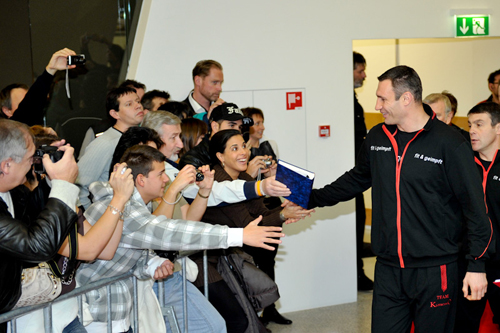 Чемпиона мира встретили ошеломляюще. Виталий Кличко вошел в зал под традиционный Hell’s Bells (AC/DC) и аплодисменты публики