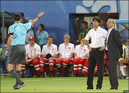 Самым интересным эпизодом первого тайма матча Германия – Австрия стал инцидент, когда испанский арбитр Мануэль Мехуто Гонсалес удалил со скамейки запасных разошедшихся тренеров команд-соперниц Йоахима Лева и Йозефа Хикерсбергера. Успокоившись, специалисты пожали друг другу руки, а Леву несколько успокаивающих слов сказала присутствовавшая на матче в Вене канцлер Германии Ангела Меркель.