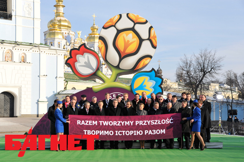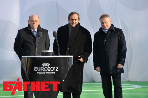 «Багнет» сообщал, что сегодня в Киеве презентовали логотип Евро-2012. После презентации состоялся брифинг, во время которого глава УЕФА Мишель Платини и президенты Федерации футбола Украины Григорий Суркис и его коллега из Польши Гжегож Лято ответили на вопросы журналистов.