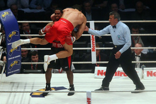 Тем не менее, у Чемберса проглядывалось явное желание что-то сделать, как-то переломить ход не слишком удачно начавшегося для него боя. Вылилось это в довольно странные действия. Когда Чемберс уходил вниз, Владимир придавливал его сверху, и во втором раунде американец просто поднял его и бросил. Движение было неприятным и неожиданным. Кличко мог получить травму, но он, как мне показалось, был скорее весело озадачен, чем серьезно обескуражен. Такие тяжелоатлетические упражнения должны были здорово утомить самого Чемберса, а он не оставлял их и в дальнейшем, но скоро стало видно, что поднять Владимира, в котором было в тот вечер 111 кг веса против 95 у самого Эдди, ему уже не под силу.