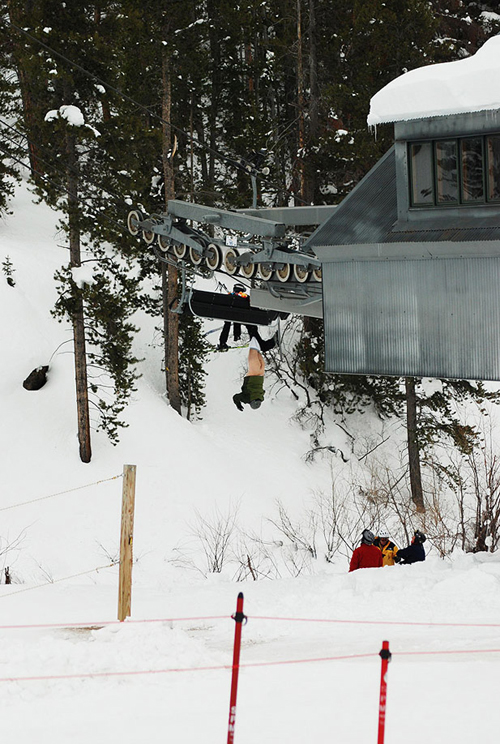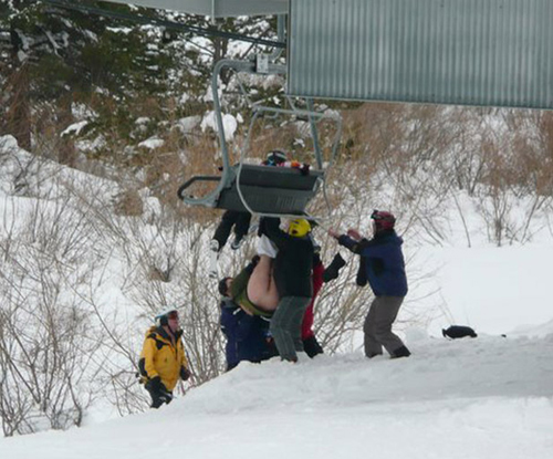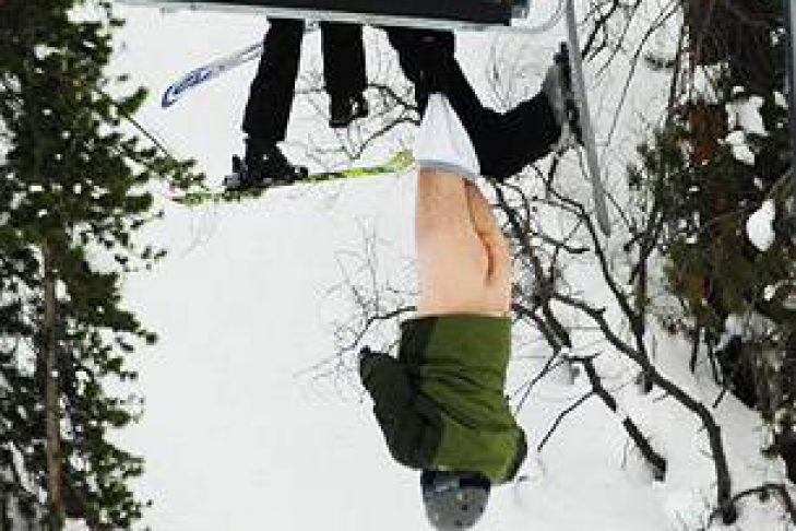 Фотограф, официально работавший на известном американском горнолыжном курорте Vail Mountain, нечаянно сделал удивительно забавный снимок. Один из горнолыжников перевернулся в кресле канатной дороги, вывесившись из него вверх ногами. При этом с него сползли штаны, оголив самые сокровенные места его тела, сообщает Life.