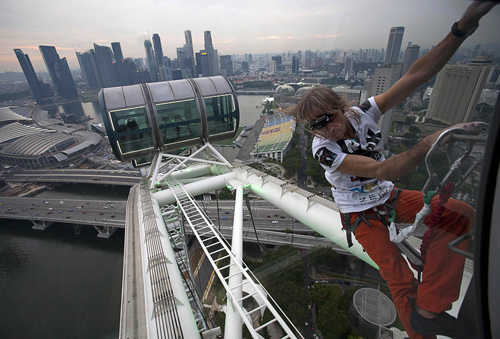 Француз Ален Робер, также известный как «Человек-паук», взбирается на 164-метровое смотровое колесо в Сингапуре (REUTERS/Vivek Prakash)