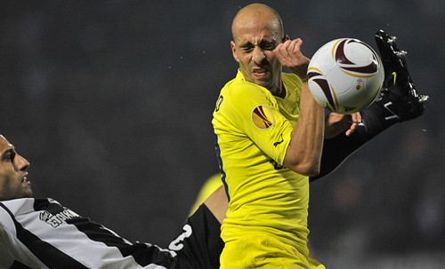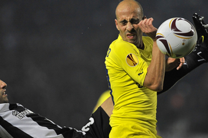 Лефтерис Сакеллару из «PAOK» (слева) борется за мяч с Борхой Валеро из клуба «Вильярреал» в матче Лиги Европы в греческом городе Салоники 4 ноябр. (AP Photo/Giorgos Nissiotis)