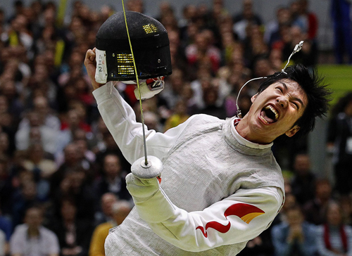Леи Шенг из Китая празднует победу над Юки Ота из Японии в полуфинале соревнования по фехтованию на рапирах на Чемпионате мира по фехтованию 2010 в Большом дворце в Париже 7 ноября (REUTERS/Eric Gaillard)