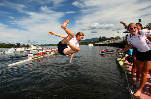 Мэри Уиппл из США бросили в воду после победы женской сборной в Чемпионате мира по гребле на озере Карапиро в Кэмбридже, Новая Зеландия (Sandra Mu/Getty Images)
