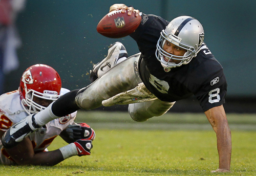 Уоллэс Гилберри из «Kansas City Chiefs» пытается остановить Джейсона Кэмпбелла из «Oakland Raiders» (справа) в матче НФЛ в Окленде 7 ноября REUTERS/Robert Galbraith)