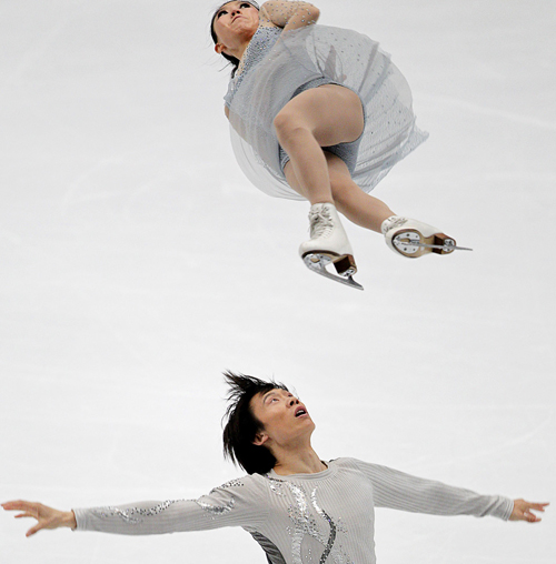 Китайская пара фигуристов Панг Цинь (наверху) и Тонг Чжиань выступают на Кубке Китая по фигурному катанию в Пекине (AP Photo/Alexander F. Yuan)