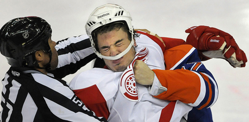 Джонатан Эрикссон из «Detroit Red Wings» борется с Гилбертом Брулом из «Edmonton Oilers» на матче НХЛ в Эдмонтоне 5 ноября (REUTERS/Dan Riedlhuber)