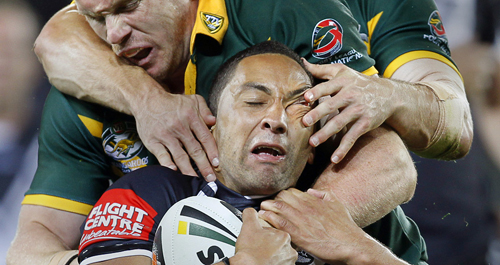 Австралиец Крис Лоуренс пытается задержать Бенджи Маршалла из сборной Новой Зеландии во время матча лиги по регби «Four Nations» в Эден-парке в Окленде 6 ноября (AP Photo/NZPA/Wayne Drought)