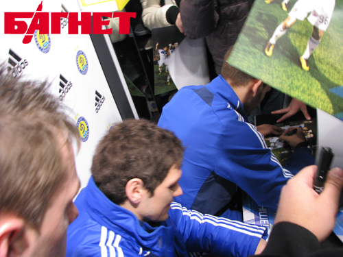 Футболисты опоздали буквально на пару минут и тут же попали в тиски своих фанатов. Чтобы пробраться за автографом к Тарасу Михалику, нужно было либо отстоять получасовую очередь, либо пробиваться с кулаками. Футболисты расписывались охотно, но общение с болельщиками не сильно удалось, ведь охранники еле сдерживали плотное кольцо, которое образовалось вокруг столика с динамовцами. О том, чтобы сфотографироваться с ними, и речь не шла.
