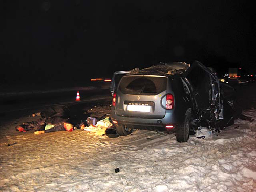 На месте происшествия работала оперативная группа Главного управления МЧС в Харьковской области. По данным Управления Госавтоинспекции в Харьковской области, со стороны Изюма в направлении Харькова двигался автомобиль Porsche Cayenne под управлением 36-летнего жителя Харькова. На 610 км автодороги Киев - Харьков - Довжанский около села Искра Изюмского района водитель не справился с управлением, выехал на полосу встречного движения и столкнулся с едущим навстречу ему направлении автомобилем Renault Duster. Личность водителя Renault пока не установлена. В результате столкновения были смертельно травмированы оба водителя и три пассажира Renault (жители Донецкой области). Милиция разыскивает родственников погибших.