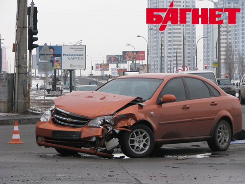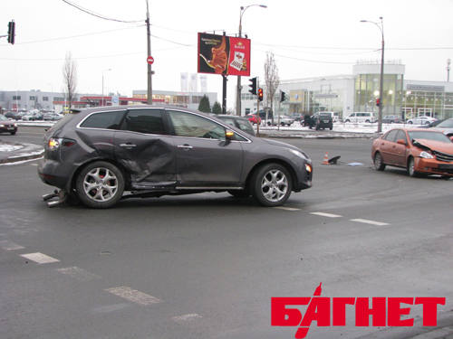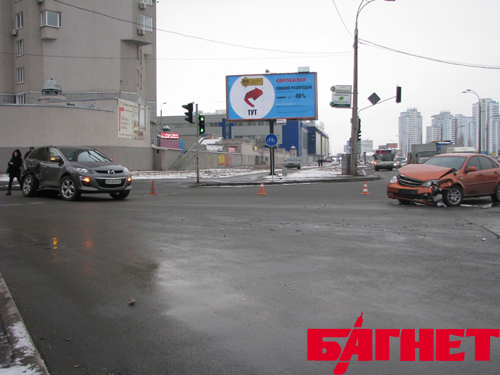 В четверг, около 16:30 на перекрестке Днепровской набережной и ул. Княжий Затон столкнулись автомобиль Mazda CX7 и Chevrolet Lacetti. К несчастью, удар был такой силы, что поврежденные авто разбросало по всему перекрестку. Несмотря на сработавшие подушки безопасности, трое людей, находившиеся в Chevrolet, были госпитализированы - пассажирка с переломом плечевой кости, ЗЧМТ и ушибами, водитель и второй пассажир - с ЗЧМТ, ушибами и ссадинами. Находившиеся в Mazda от госпитализации отказались.