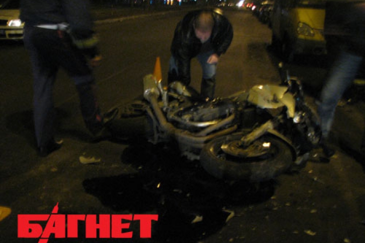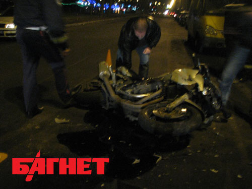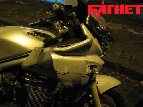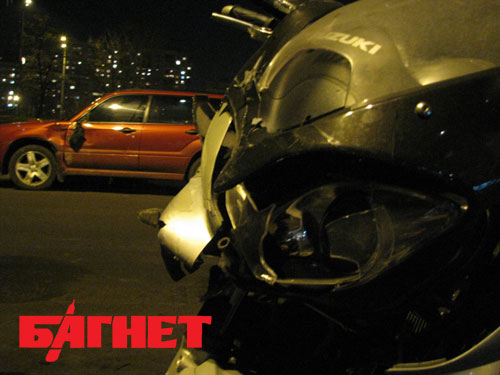 В понедельник вечером на ул. Серафимовича столкнулись мотоцикл Suzuki GSF1200 Bandit и Subaru Forester. По словам очевидцев, мотоцикл двигался в потоке автомобилей по ул. Серафимовича в направлении Днепровской набережной. Внезапно прямо перед ним, пропустив движущийся перед Suzuki автомобиль, от правой обочины в попутном направлении начал выезжать Subaru. Почему водитель Subaru пропустил легковой автомобиль и не заметил ехавший за ним мотоцикл - водитель объяснить не смог. Объехать внезапно возникшее препятствие у мотоциклиста не было возможности - слева у бордюра стоял припаркованный грузовик ЗИЛ, а выехавший Subaru перекрыл всю правую полосу. Удар мотоцикла пришелся в левую переднюю часть автомобиля. К счастью, навыки мотоциклиста (он оказался профессиональным спортсменом) помогли ему предотвратить серьезные травмы, сгруппировавшись при падении. Мотоциклист перелетел через автомобиль и правильно приземлился на дорогу, не получив ни единой царапины. В то же время, сам мотоцикл получил серьезные повреждения - полностью разбит перед транспортного средства, погнута передняя вилка, из треснутой крышки двигателя вытекло масло. Автомобиль-виновник остался со смятым крылом, дверью и оторванным зеркалом - таковы последствия невнимательности водителя.