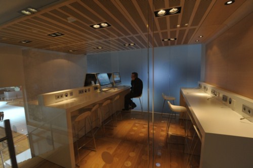 Окружение: выбор древесины для пола помогает создать окружение и приятные впечатления. Она замечательно демонстрирует то, которое представляет собой скандинавский дизайн – ощущение расслабления и самосозерцание. Технологии: расположения трех основных экранов, которые видно из любого угла выставочного зала, а также в смежной комнате является идеальным. Специально отделенная комната позволяет посетителю удобно и элегантно использовать и познавать новые технологии.