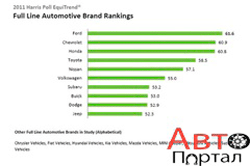 Ford занял первое место среди автопроизводителей всех типов автомобилей, опередив Chevrolet, Honda и Toyota. Chevyзанял второе место, в то время как Toyotaс первого места упала аж на четвертую позицию. Хотя Hyundai и Kia не попали даже в десятку лучших, по итогам опроса они были названы как быстро развивающимися торговыми марками.