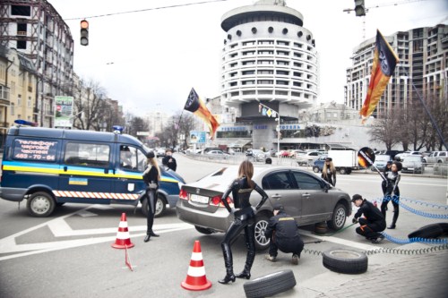В течение трех дней на оживленных киевских перекрестках, не препятствуя дорожному движению, команда Premiorri провела около ста скоростных замен шин на автомобилях. Каждый из них был «переобут» в британские летние шины Premiorri Solazo за 38-42 сек., т.е. за время, пока горел красный свет светофора. Особое внимание у участников дорожного движения вызвали очаровательные девушки ? участницы акции.