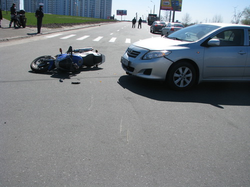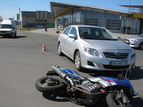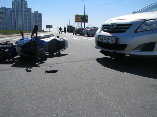 Вчера на Днепровской набережной женщина - водитель Toyota, выезжая с территории рынка, не пропустила движущийся по главной дороге мотоцикл Zongshen. Пилот мотоцикла явно не ожидал такого грубого нарушения правил дорожного движения от водительницы Toyota, применил экстренное торможение, однако, несмотря на небольшую скорость, столкновения избежать не удалось. Автомобиль по касательной ударил мотоцикл в правый бок. Несмотря на защитную экипировку, врачи скорой помощи диагностировали у пилота закрытую черепно-мозговую травму и двойной перелом костей голени. По рассказам очевидцев - мотоцикл двигался по Днепровской набережной и намеревался выехать на проспект Бажана в сторону Южного моста. На повороте на проспект находится выезд с территории рынка, откуда и выезжала Toyota. Несмотря на то, что безопасно выехать с рынка можно, лишь повернув направо, водитель Toyota решила выехать сразу же на эстакаду, минуя поворот на проспект Бажана.