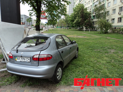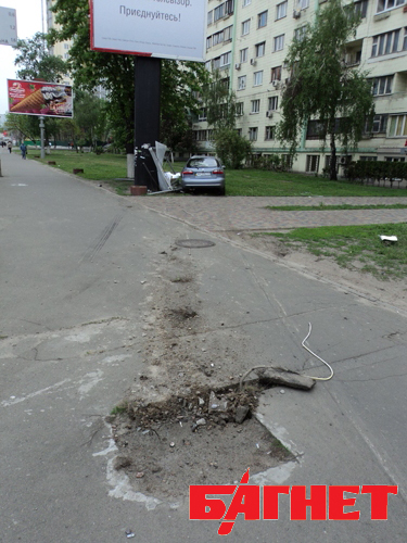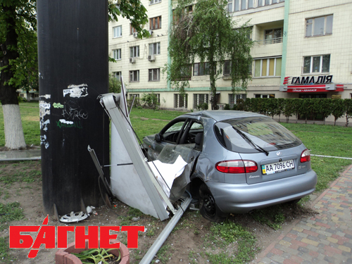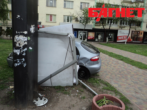 Сегодня ночью, 5 мая, на Проспекте Победы, 22 ЗАЗ Деу серого цвета снес сити-лайт, размещенный на тротуаре, протащил его около 15 метров и врезался в массивную рекламную конструкцию. Об иронии судьбы, разумеется, говорить не приходится, но на рекламном щите, как не цинично, большими буквами написано «Приєднуйся!».