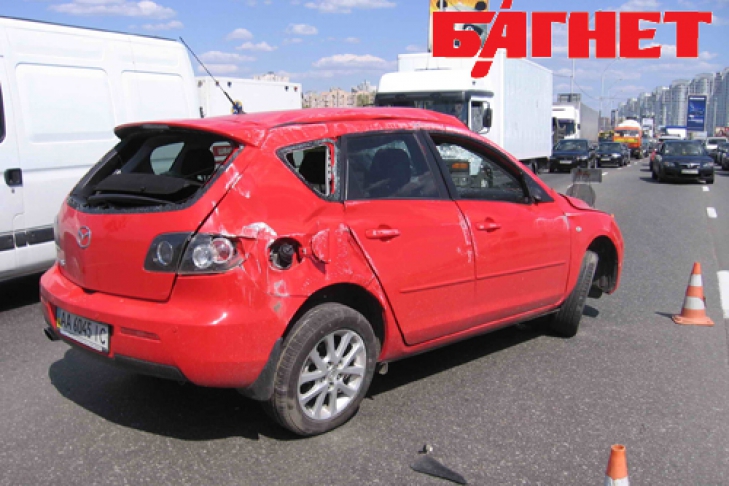 Сегодня, 12 мая, в Киеве на проспекте Бажана в направлении Южного моста напротив ст.М. Славутич перевернулся автомобиль Мазда. По предварительным данным, авария произошла следующим образом: автомобиль, двигаясь на большой скорости, начал перестраиваться с левого ряда в правый, в момент совершения маневра авто попало в колею на асфальте, в результате машину кинуло в сторону. Далее, авто, ударившись о бордюр, перевернулось несколько раз и встало обратно на колеса. К счастью, никто не пострадал. В автомобиле находились двое маленьких детей. За рулем была девушка.