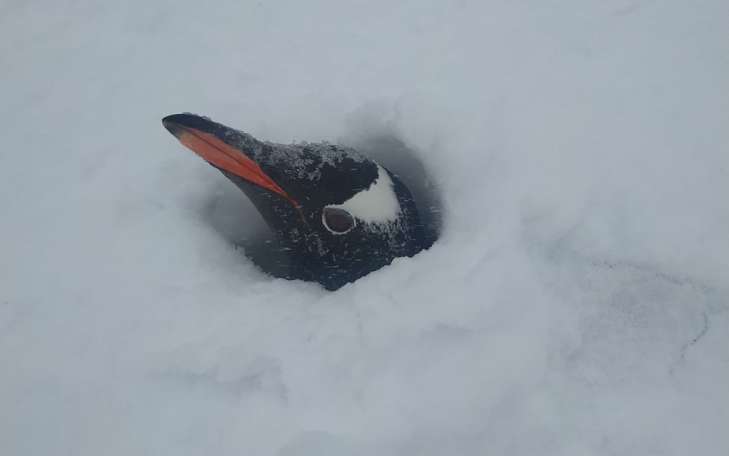 Снег полностью засыпал гнезда пингвинов, которые расположены в низинах. На опубликованных фото можно увидеть, что из гнезд выглядывают лишь головы птиц.