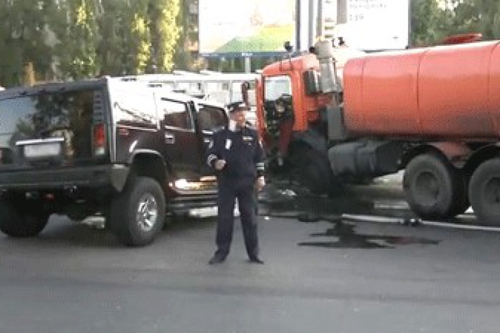 В Воронеже (Россия) столкнулись, как говорится лоб в лоб, чёрный внедорожник «Хаммер» и убиравшая дорогу поливальная машина КамАЗ. Удар был настолько сильный, что грузовик отбросило в сторону на несколько метров, и он врезался в столб рекламного щита.